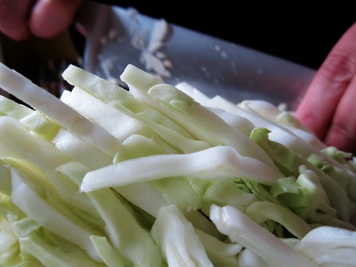 Den Weisskohl vierteln, den Strunk herausschneiden und in feine Streifen schneiden. In einem grossen Topf etwas Olivenöl erhitzen, die Weiss­kohlstreifen hineingeben und unter ständigem Rühren leicht anbraten und zusammenfallen lassen (Vorsicht: Nicht anbrennen lassen!). Mit Weisswein und Essig ablöschen, Salz, Kümmel und Zucker dazugeben, gut durchrühren und zugedeckt auf kleiner Flamme mindestens 45 Minuten weich schmoren, gelegentlich umrühren.