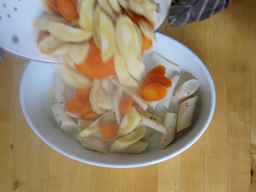 Die Schwarzwurzeln unter fliessendem Wasser gut waschen, mit einem Sparschäler schälen, in ca. 5 cm lange Stücke schneiden und sofort in einen Topf mit Wasser geben, das mit dem Essig und dem Mehl versetzt wurde. Auf‌kochen und 10 Minuten kochen lassen. Die Karotten und die Pastinaken schälen, schräg in ca. 5 mm dicke Scheiben schneiden und in Salzwasser ebenfalls 10 Minuten kochen.